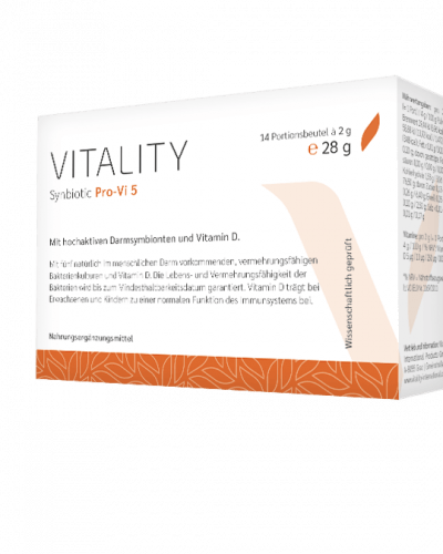 Speziell für das Immunsystem fordernde Zeiten wurde VITALITY Synbiotic Pro-Vi 5 entwickelt: Die innovative Kombination aus 5 speziell ausgesuchten Bakterienstämmen ergänzt die Darmflora bei jeder Einnahme mit 5 Milliarden natürlich im menschlichen Darm vorkommenden Symbionten. Als besonderes Extra wurden die wissenschaftlich ausgewählten Bakterien mit Vitamin D kombiniert, welches für die Aufrechterhaltung der normalen Funktion Ihres Immunsystems eine bedeutende Rolle spielt.